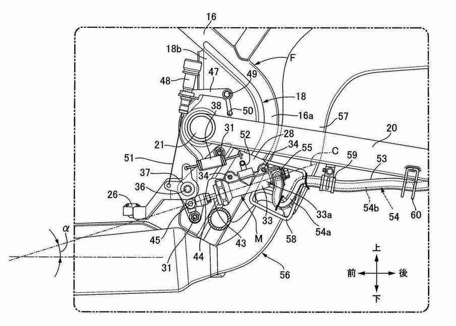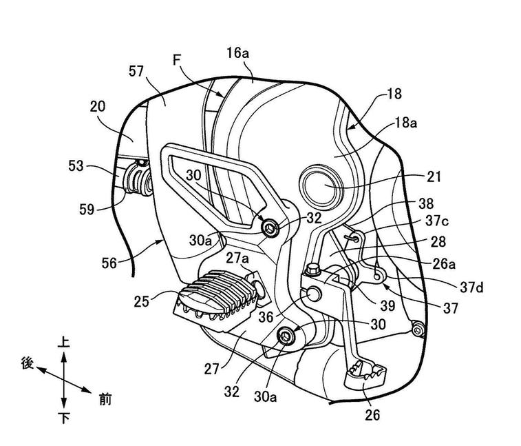 Решение Honda кажется простым: в патентной заявке показаны подножки, крепящиеся на легкосплавной пластине, которая в свою очередь привинчена к штатным креплениям на раме, но это создаёт новую проблему для конструкторов - с размещением главного тормозного цилиндра заднего тормоза и концевика стоп-сигнала. В патенте 2019 года объяснено решение этих вопросов.