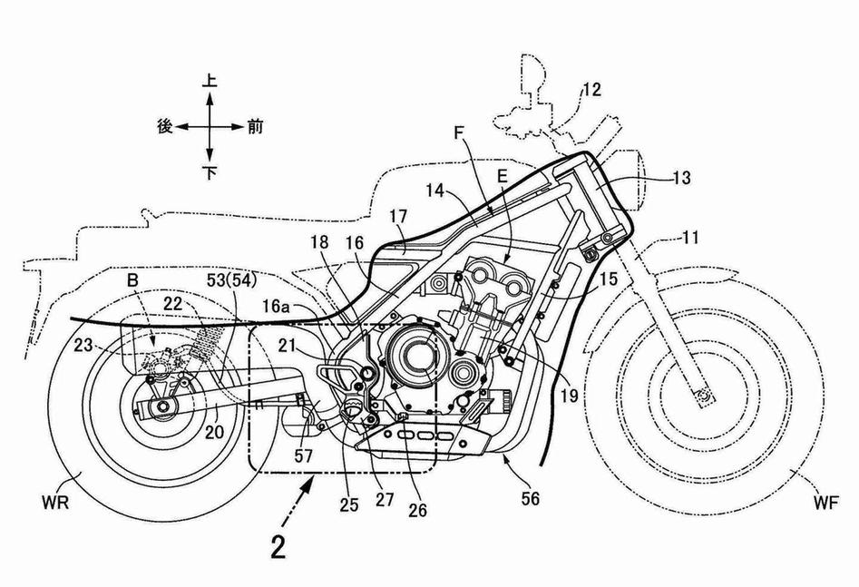 Свидетельства того, что Honda разрабатывает скремблер на основе 471-кубовой рядной двойки от Rebel 500, впервые появились в 2019 году, когда компания подала патентные заявки относительно крепления подножек скремблерного типа на раму Rebel. На оригинальном Rebel подножки с рычагами установлены на кронштейнах, выдающихся вперёд из области шарнира маятника. Но на скремблере подножки должны быть расположены дальше назад, под сиденьем, чтобы на них было легко вставать в стойку для прохождения неровностей.