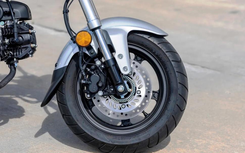 На ходу Honda Dax 125 2025 на удивление мягкий, хорошо отрабатывает ухабы, тормоза тоже на уровне. Рычаг переднего тормоза расположен удобно, а тормозное усилие ровно такое, какое нужно на мотоцикле этой мощности и размера. Единственный минус - это непонятная резина на 12-х колёсах. Сам размер колёс делает минимото шустрым и лёгким в поворотах, но шины слишком уж охотно проскальзывают на разметке при перестроении. И не скажешь ведь, что Dax слишком быстрый или тяговитый - речь о скорости в пределах 20-30км/ч.