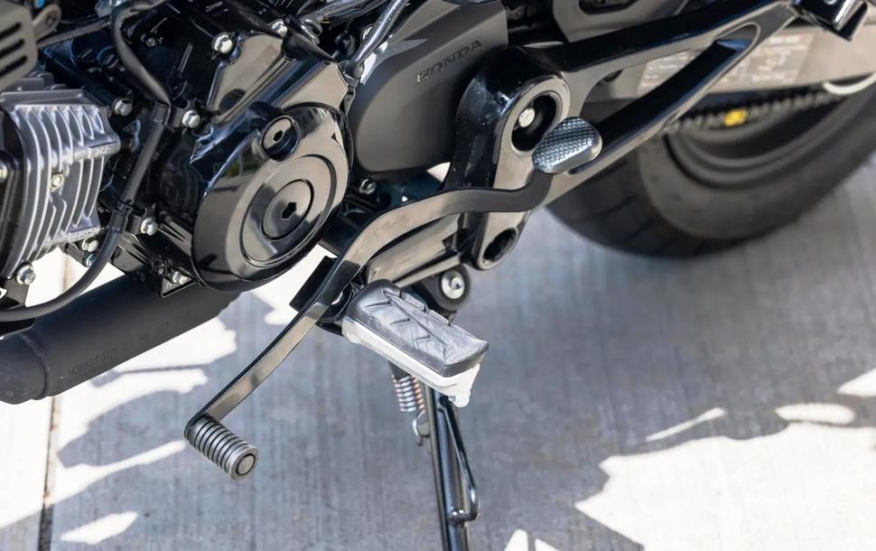 Двигатель Honda Dax 125 2025 - точно такой же, как на Grom, почти горизонтальная одностволка объёмом 124 кубика (да, на 1 куб меньше, чем название модели). Только в отличие от Grom, на Dax передачи переключаются полуавтоматически, как на оригинальной модели. Рычага сцепления на нём просто нет: прощёлкиваешь лапкой коробки вниз до нейтрали, а оттуда - вверх до четвёртой, каждый раз отпуская газ. Вниз - точно так же: закрыл газ, нажал качельку вниз, снова открыл газ. Похоже на квикшифтер, да? Но не совсем: вместо прерывания зажигания или каких-то хитрых роботизированных систем здесь попросту выжимается сцепление в начале нажатия на лапку коробки. Поэтому всё это работает далеко не так мягко и чётко, как на дорогих трансмиссиях с квикшифтером. Зато и заглохнуть от неаккуратной работы коробкой двигатель не может.