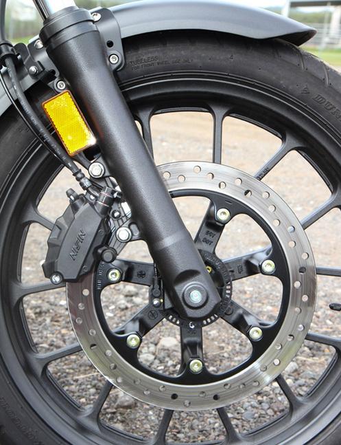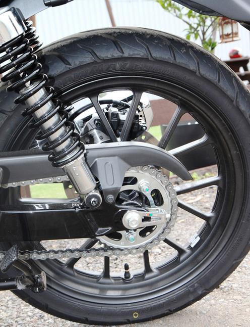 Ретро-тема касается и размера колёс: 19-е спереди и 18-е сзади, обутые в узкие шины, 100/90 спереди и 130/70 сзади. Широкое, длинное сиденье, обшитое искусственной кожей, имеет высоту 800мм, достаточно удобную для большинства райдеров. Ещё мотоцикл оснащён удобной центральной подставкой, большими пассажирскими подножками и задним поручнем, а также 15-литровым баком (запас хода больше 500км), и всё это при весе 181кг. Передний тормоз - 310-й диск с двухпоршневым Nissin, а сзади - довольно избыточный 240-й диск, как любят на азиатских рынках.