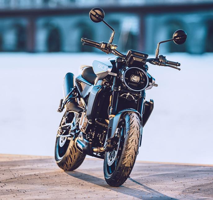 Что касается характеристик Vitpilen 801, то тут всё ожидаемо: мотоцикл построен на раме из хром-молибденовой стали с нагруженным корпусом двигателя, регулируемые подвески от WP имеют ходы 140мм спереди и 150 сзади, а задний маятник имеет открытую решётчатую конструкцию. Колёса 17-дюймовые, самые типичные для дорожников, оборудованы суппортами от J.Juan и ABS от Bosch. Вероятнее всего, что шасси и двигатель напрямую позаимствованы у KTM 790 Duke, но в плане внешнего вида Vitpilen, конечно, поинтереснее, чем австрийский дорожник. Что касается двигателя, это это прекрасная 799-кубовая рядная двойка, выдающая до 105лс на 9250об/мин и 87Нм на 8000об/мин. Среди прочих технических особенностей стоит упомянуть трекшн-контроль, чувствительный к наклону, несколько режимов езды, режим Supermoto ABS, TFT-дисплей и опциональный квикшифтер.