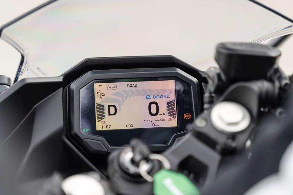Статус e-boost, уровень заряда батарей, текущая скорость и другая полезная информация отображается на 4,3-дюймовом TFT-дисплее мотоцикла, а также, включая статус батареи, может быть просмотрена через приложение Kawasaki Rideology на смарт-устройствах.