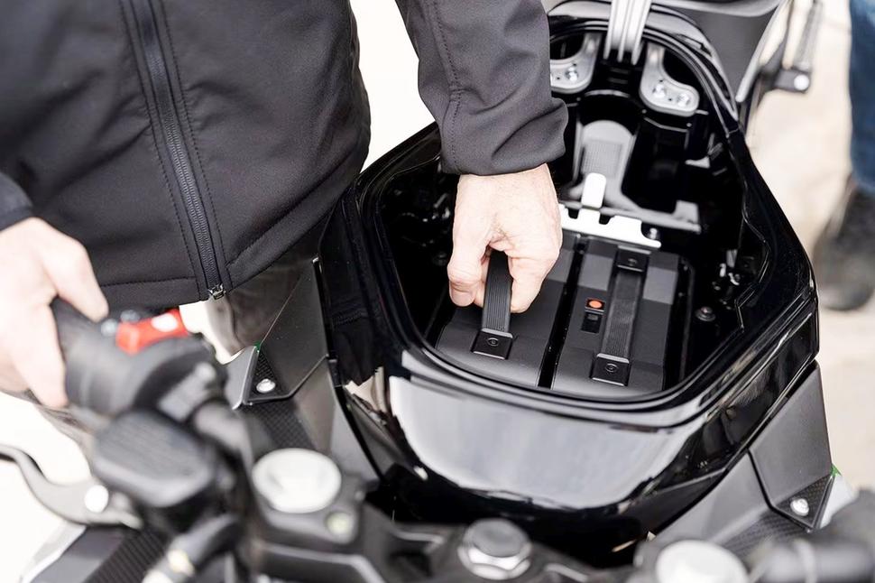 Аккумуляторы можно заряжать как в мотоцикле, так и сняв их и разместив в удобном месте дома или в офисе. Зарядное устройство при этом используется одно и то же, а работает оно от обычной розетки. Интересно, что в мотоцикле батареи можно заряжать одновременно, а при зарядке снятых батарей - только по очереди, занимает это по 3,7 часа на каждую. Естественно, подзаряжать их можно и не до конца: за 1,6 зарядник способен пополнить заряд одной батареи с 20 до 85 процентов - примерно как у многих современных телефонов.