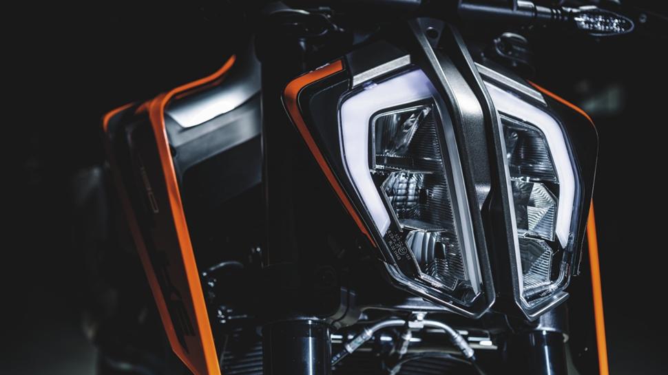 Представители KTM говорят, что Duke 790-ый создавался не для того, чтобы потеснить какую-то определенную модель. Но в результате получилось найти собственное решение, чтобы соответствовать форме мотоцикла типа нэйкед. Передний щиток обрезан настолько, чтобы закрывать только радиатор и пилота с балками, защищающими зону хода передней вилки. Светодиодная фара, имеющая небольшой корпус, распадается на две части и задает тон всему остальному дизайну.