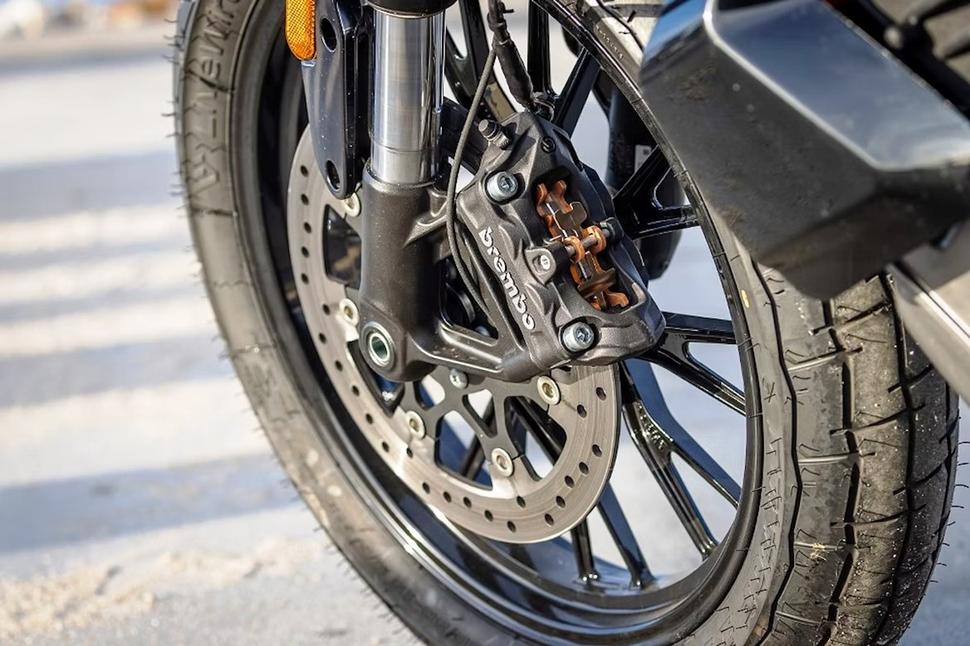Впрочем, всё это не страшно, потому что LiveWire S2 Del Mar и выглядит тоже скромно. У него только один тормозной диск спереди, на левой стороне колеса, так что когда он стоит на боковой подставке, то являет взору "голую" сторону колеса, как и положено флэт-трекеру. Между коленями мотоцикл удивительно узкий, так что высота по седлу 81см даже не особо замечается.