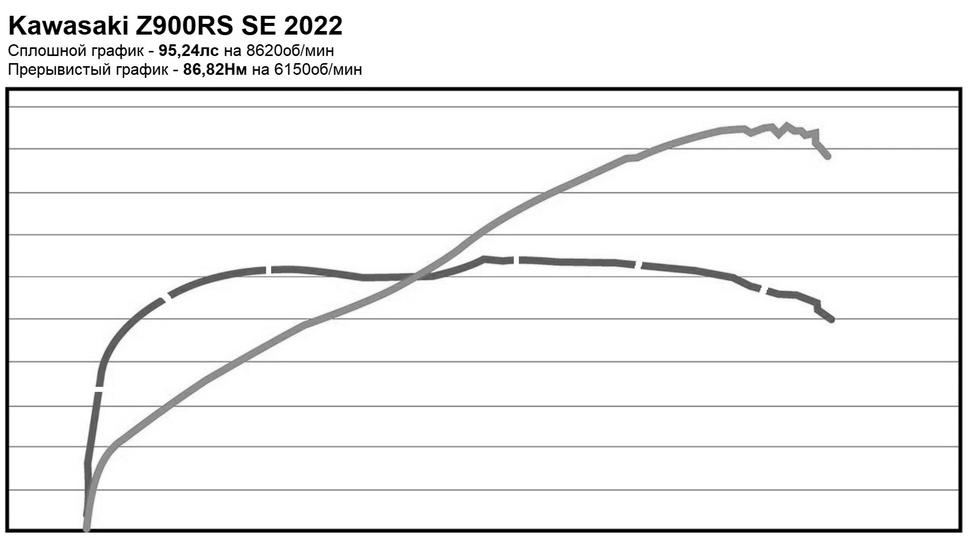 На диностенде Kawasaki Z900RS SE 2022 показал пик мощности в 95,24лс на 8620об/мин и 86,82Нм на 6150об/мин. Отдельно стоит отметить ровный график мощности и относительно плоскую полку крутящего момента, где уже с 3000об/мин доступно свыше 80Нм тяги.