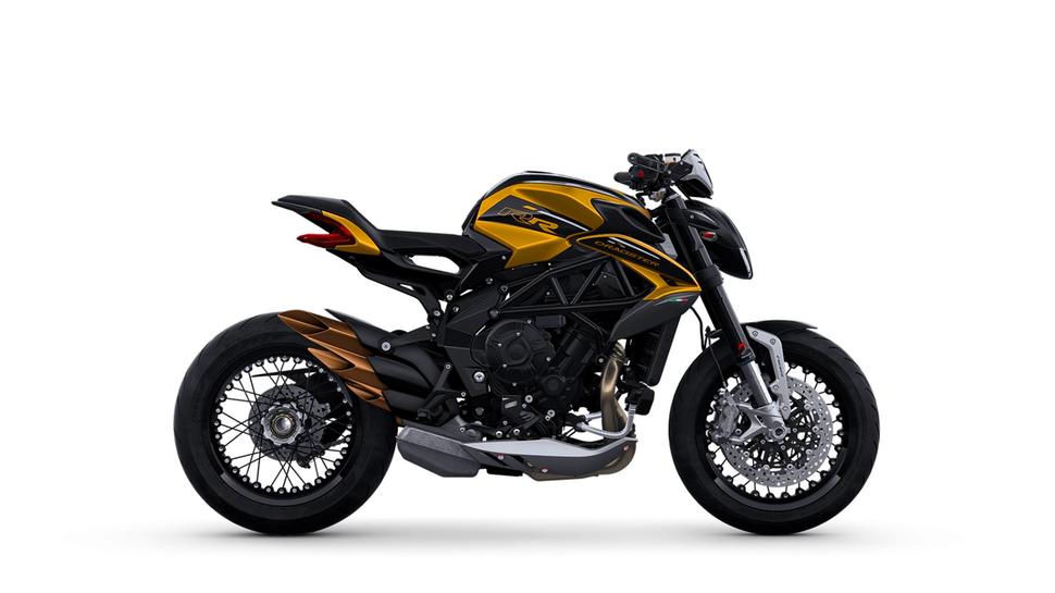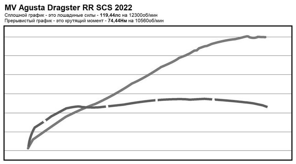 На диностенде MV Agusta Dragster RR SCS 2022 показал пик в 119,44лс на 12300об/мин и 74,44Нм на 10560об/мин. Для сравнения, довольно близкие характеристики показали Triumph Street Triple RS (115,2лс/76Нм) и Yamaha MT-09 SP (107,2лс/85,8Нм). Самое приятное в MV Agusta - то, какую ровную полку момента она выдаёт с низких оборотов и до самой отсечки. Выходная мощность при этом выходит за пределы 100лс только после 9500об/мин, так что пиковую производительность этот двигатель имеет на весьма высоких оборотах.