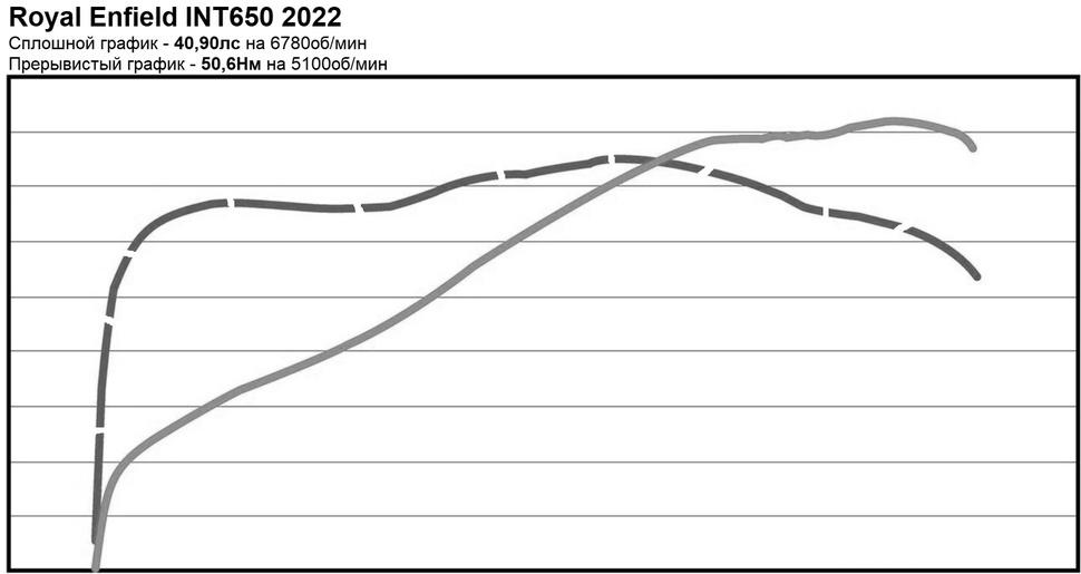 На диностенде Royal Enfield INT650 показал пик в 40,90лс на 6780об/мин и 50,6Нм на 5100об/мин. Не слишком умопомрачительные цифры, но обратите внимание на то, насколько плавный у него набор мощности и ровная, высокая полка момента. Уже с 2000об/мин он выдаёт свыше 45Нм, и только после 6000об/мин выдыхается, но без особо критичных провалов.