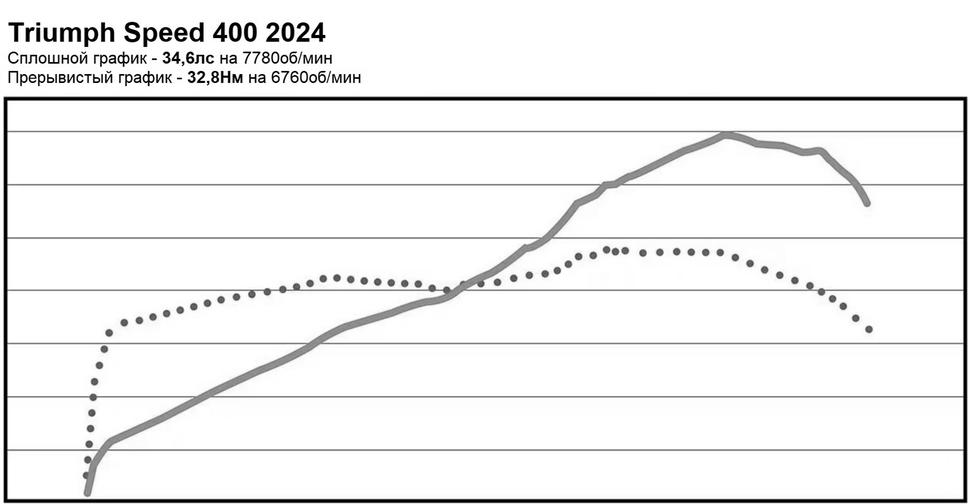 Triumph Speed 400 2024 года с полным баком весит 173,7кг, а на диностенде с заднего колеса он показал 34,6лс на 7780об/мин и 32,8Нм на 6760об/мин. Для сравнения, Husqvarna Vitpilen 401 2024 года на том же стенде выдала пиковые 38,9лс на 9000об/мин и 32,4Нм на 6670об/мин.