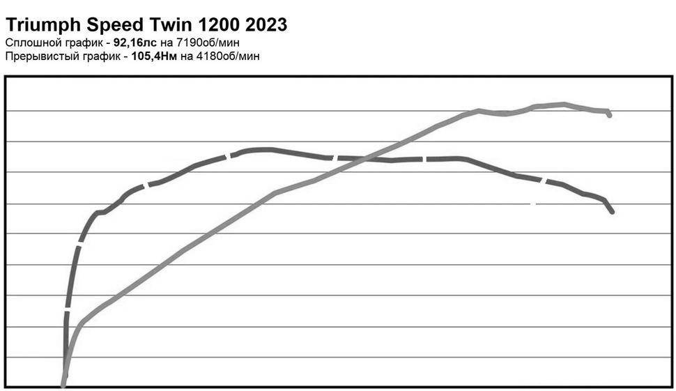 На диностенде Triumph Speed Twin 1200 2023 выдал 92,16лс на 7190об/мин и впечатляющие 105,4Нм на 4180об/мин. Таким образом, инженерам компании удалось получить даже некоторый прирост пиковой мощности: прошлая версия выдавала 91,4лс в тех же условиях. Однако, облегчение коленвала сказалось на максимуме тяги: прошлый вариант Speed Twin показывал пиковые 107,1Нм.