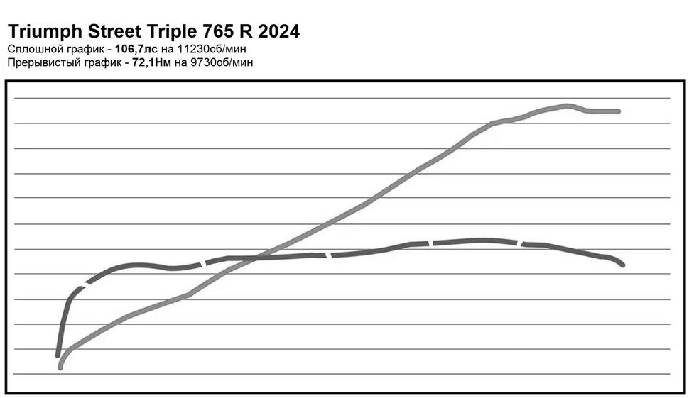 Шасси Street Triple 765 R состоит из алюминиевой двухлонжеронной рамы, полностью настраиваемой 41-й вилки Showa Separate Function Big Piston, полностью настраиваемого амортизатора Showa, 17-х колёс и двух четырёхпоршневых радиальных моноблочных суппортов Brembo M4.32 на переднем. Всё это в снаряжённом состоянии весит 190кг, а на диностенде Triumph Street Triple 765 R 2024 года показал пиковые 106,7лс на 11230об/мин и 72,1Нм на 9730об/мин. Кривые мощности и тяги говорят сами за себя - чрезвычайно линейные характеристики делают рядную тройку Triumph потрясающе эластичным на любых оборотах.