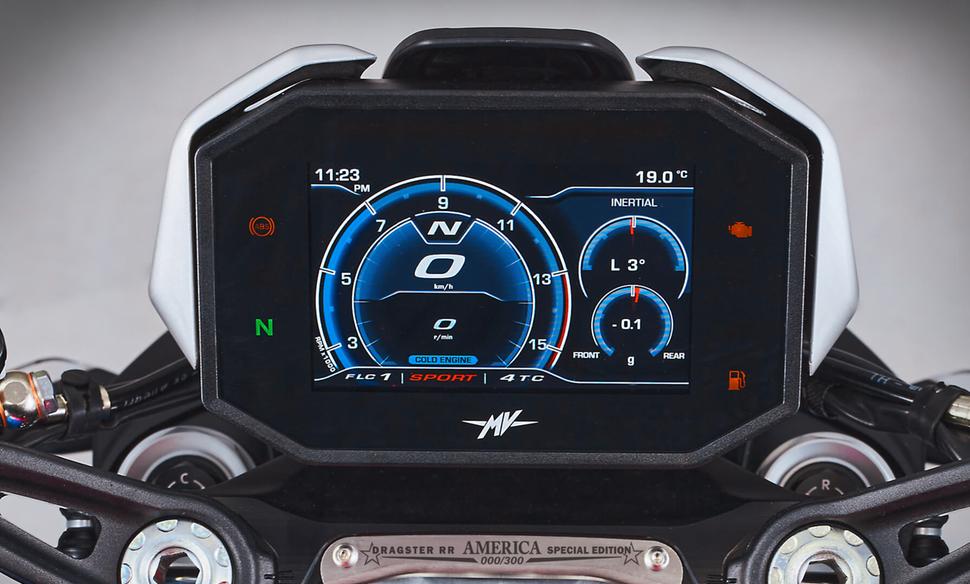 5,5-дюймовый TFT-дисплей MV Agusta Dragster RR SCS America удобен и неплохо читается, когда освоишься, и, как обычно, к нему можно подключить смартфон по Bluetooth. Приложение MV Ride App позволяет сохранять информацию о поездках для просмотра таких данных, как маршрут, максимальная скорость и углы наклона. Пожалуй, более интересен встроенный в мотоцикл GPS-функционал, позволяющий отслеживать его местоположение в реальном времени - можно, например, приглядывать за другом, взявшим его покататься. Обслуживание этого сервиса будет стоить 50 долларов в год, первый год - бесплатно.