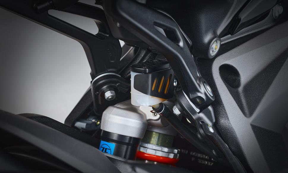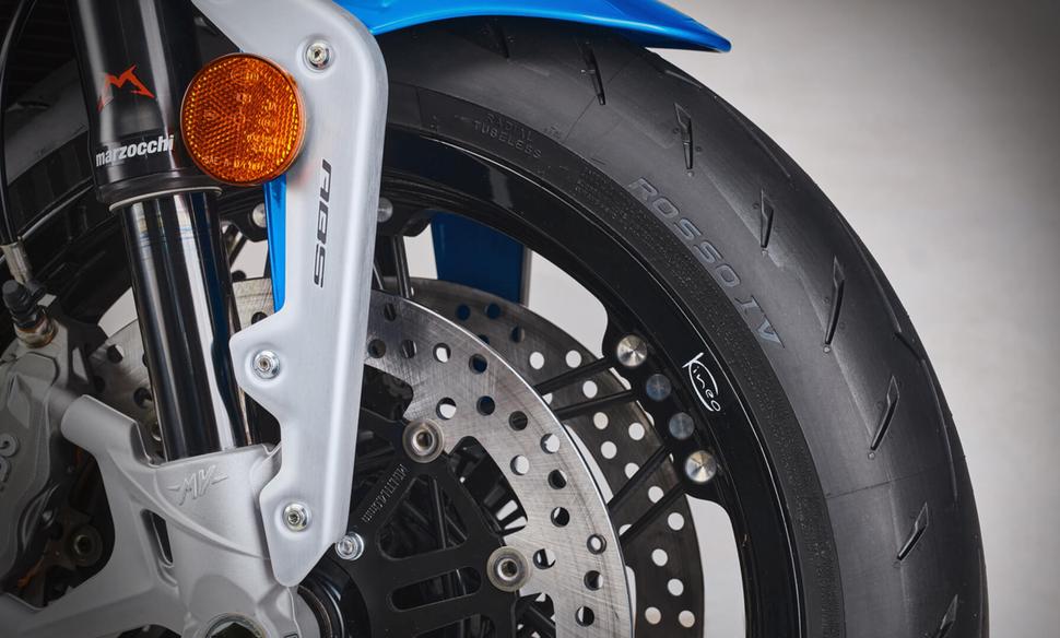 Тормозная система представляет собой результат совместных усилий Brembo, Nissin и Continental. Радиальные суппорта Brembo M4.32 спереди стоят на 320-х плавающих дисках, а на заднем колесе установлен двухпоршневой Brembo на 220-м диске. Передний ГТЦ от Nissin имеет цельную конструкцию, но без радиального поршня, и оба контура оснащены ABS от Continental. Для мотоцикла и производителя, настолько завязанного на престиже и малосерийности, передний контур несколько обескураживает: он работает отлично, но искусство построения систем торможения для спортивных мотоциклов продвинулось вперёд довольно далеко относительно уровня компонентов. В этой ценовой категории ожидаешь суппорта Stylema и радиальный ГТЦ. Возможно, выбор главных цилиндров тормоза и сцепления был обусловлен стилистически благодаря их более низкому профилю?
