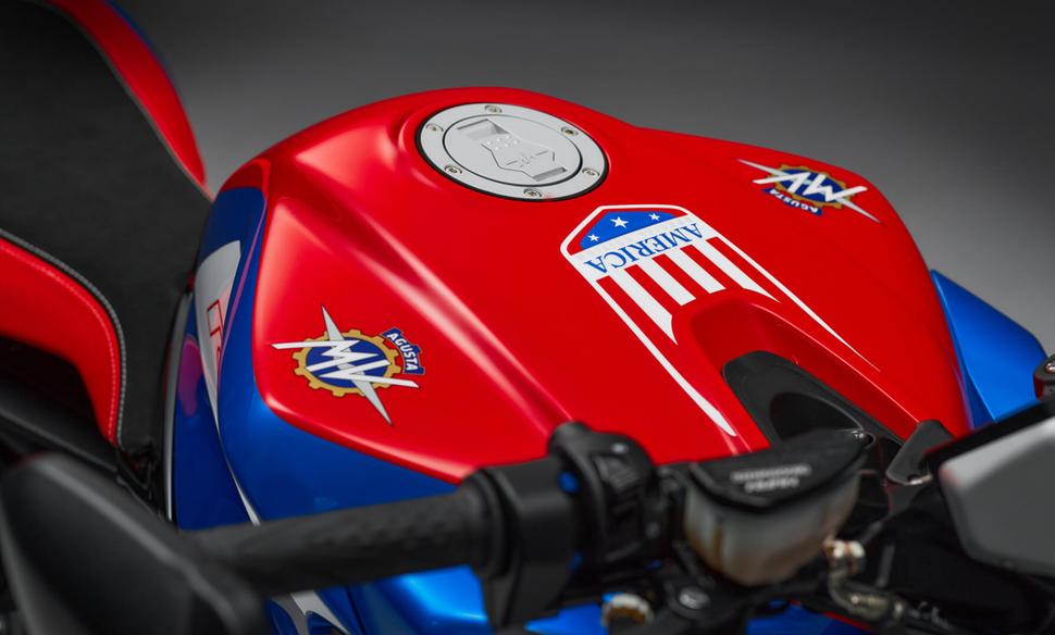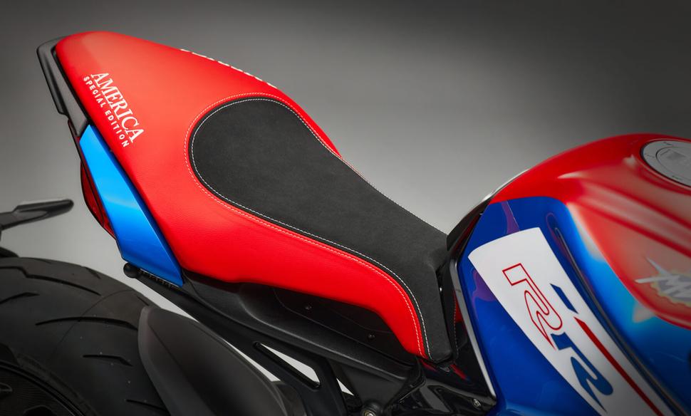 По названию понятно, что в основном это Dragster RR SCS с несколькими эксклюзивными компонентами. Но что означает America в названии? Ну, для начала - расцветку, красно-бело-голубую. Даром, что дизайнеры не рискнули оформить карбоновую заглушку заднего колеса в стиле щита старины Кэпа, но аллюзии всё равно прослеживаются, а на ходу так и не отличить. Возмутительно красное сиденье с вышитым в двух местах "America Special Edition" притягивает внимание, переходя в красно-сине-белый бак, и этот мотоцикл весь в этом. В комплекте, как и со всеми MV Agusta, идёт знаменитая коробочка, посвящённая конкретной модели, в которой в данном случае будет лежать сертификат подлинности, кастомный чехол на мотоцикл и прозрачная крышка сцепления, как на фотографиях. Дело в ограничениях по шуму, которые мотоцикл не прошёл бы с установленной прозрачной крышкой, поэтому она и поставляется отдельно, как аксессуар. И, наконец, ещё одной важной особенностью America Special Edition стала номерная табличка на верхней траверсе, на которой указано, что мотоцикл является одним из трёх сотен выпущенных экземпляров, предназначенных для продажи исключительно в США.