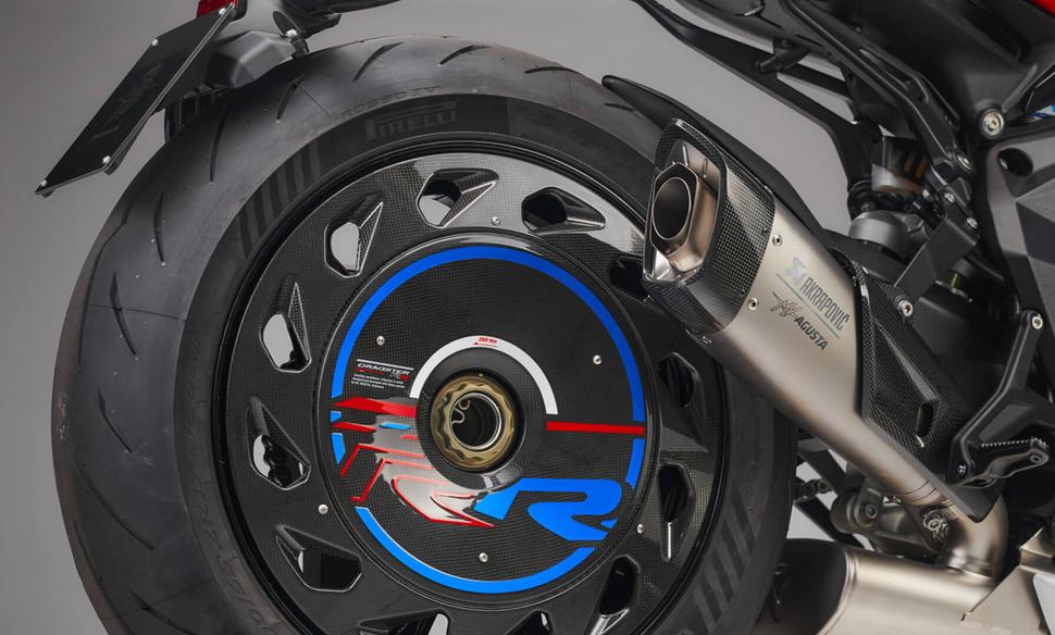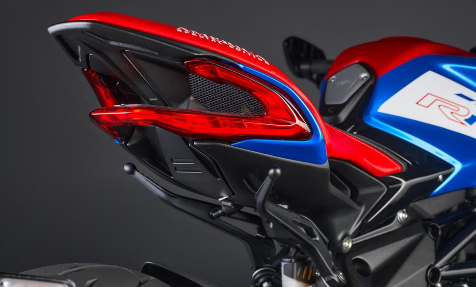 Задний тормозной контур получил новый ГТЦ, о чём несколько раз упомянули на брифинге для прессы. Теперь он спрятан под двигателем, а его бачок - внутри рамы около заднего амортизатора. Новая конструкция обеспечивает, по словам представителей фирмы, более стабильную характеристику торможения, потому что по отзывам других мотожурналистов, на прежних MV нередко возникали проблемы с перегревом заднего тормоза. Ещё одной интересной особенностью заднего контура стало наличие дополнительной тормозной педали перед основной - она предназначена для стояночного тормоза, который необходим из-за автоматического сцепления SCS.