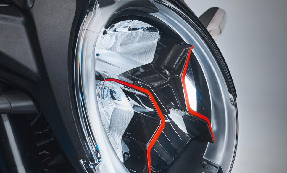 В остальном мотоцикл остался почти без изменений. 798-кубовый двигатель имеет те же 79х54,3мм диаметра и хода со степенью сжатия 13,3:1. Головка с двумя валами приводит 12 обычных клапанов с соосными штоками (а не радиальных, как в рядных четвёрках MV). На впуске стоят 50-миллиметровые дроссельные заслонки Mikuni, а на выходе - шикарный тройной выхлоп. Коленвал обратного вращения передаёт 140 лошадок в пике на кассетную шестиступенчатую трансмиссию постоянного зацепления.