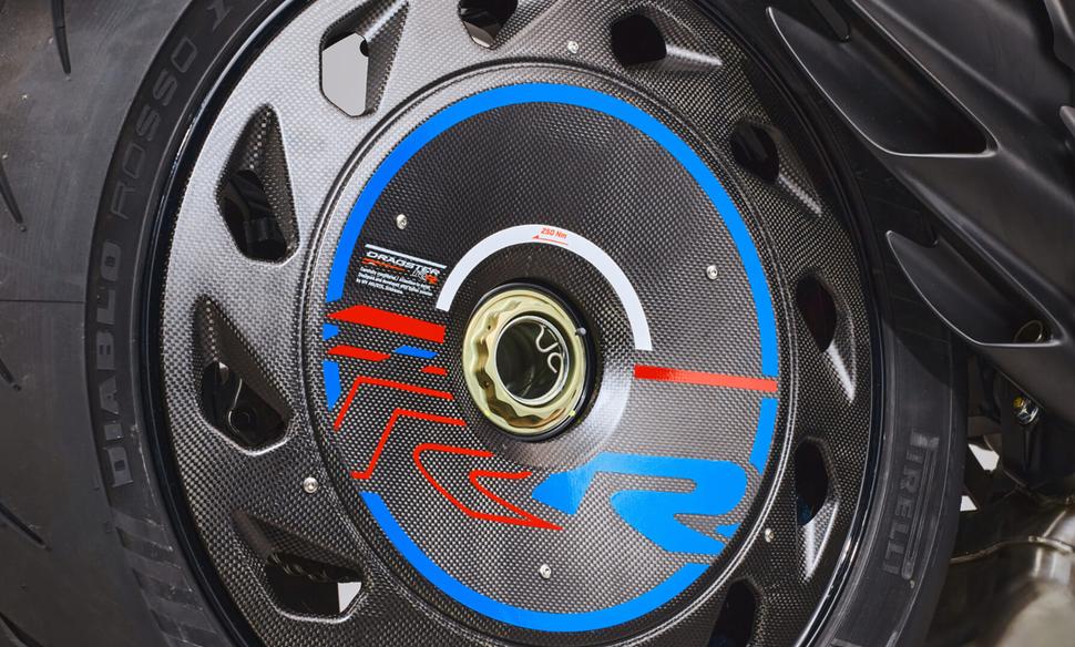17-е переднее колесо имеет спицованную конструкцию и предназначено под бескамерную резину шириной 3,5 дюйма. Широкий задний диск шириной 6,0 дюймов изготовлен из кованого алюминиевого сплава, который, впрочем, практически полностью скрыт карбоновой заглушкой, окрашенной в цвета Dragster America. Передняя шина имеет размеры 120/70-ZR17, а задняя - 200/55-ZR17.