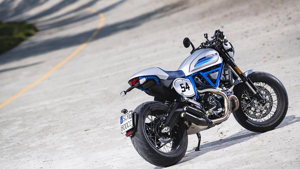 Название Café Race говорит само за себя: это Scrambler в ретро-стиле. Его дизайн был создан на основе Ducati 125GP Desmo из конца 50х годов. Модель представлена в яркой серебряно-синей гамме, с винтажным логотипом Ducati Scrambler на баке. На нём установлены клипоны с зеркалами, установленными в их торцах, а также спицованные колёса и синее сиденье.
