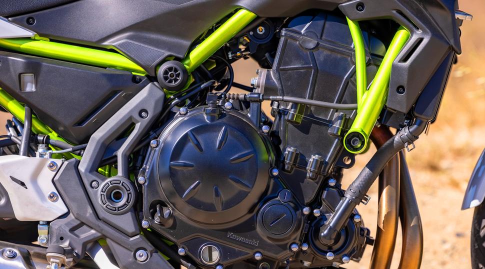 На коротких прямиках Kawasaki Z650 2021 уверенно держится наравне с другими, благодаря тяговитому на низах и средних оборотах мотору. На длинных уже похуже, потому что оставшиеся пятеро попросту мощнее. Характером мотора Z650 напоминает всё то хорошее, что есть в Suzuki - мощные тяговитые низы и средние, при этом весьма неплохие верха. Плюс приятный вой впуска. Вибрации на верхах у него есть, но не слишком противные, ощущаются через сиденье, а не руль ("сушат" задницу, а не руки), но на 130км/ч и 6000об/мин их совершенно нет. Кстати, порядок вспышек у этой рядной двойки - 180 градусов. Почти V-твин.