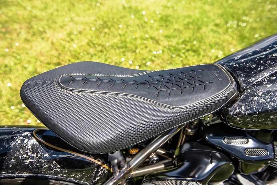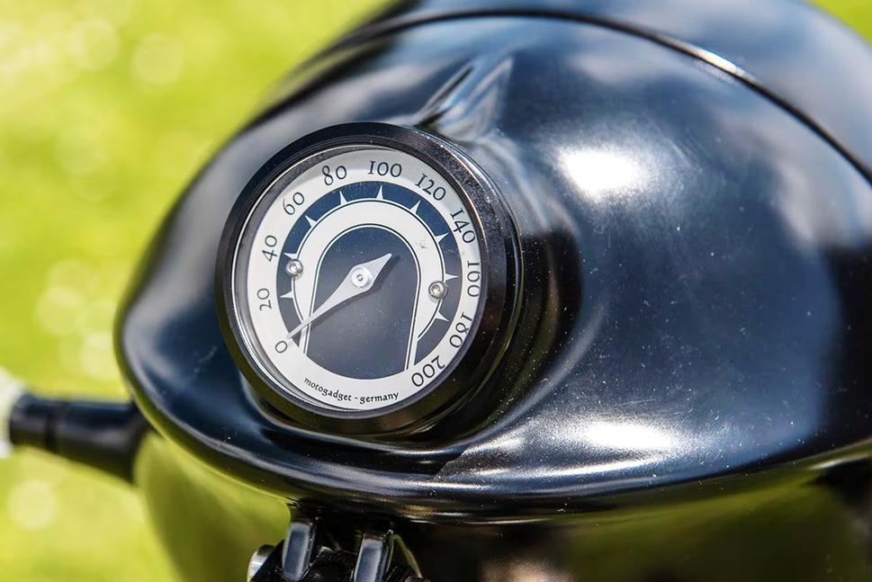 Когда осторожно и бережно садишься в симпатичное одиночное седло, сразу чувствуешь, насколько этот мотоцикл лёгкий и узкий. Руль, однако, широкий, как у всего, что выпускалось в 1928 году, а вид крупных флейков карбонового обвеса переносит вас в будущий мир неразбавленных экстравагантных концепций. Одно нажатие карбоновой кнопки электростартера, и обычно тихий длинноходный твин оживает. Двойной выхлоп очевидно ручной работы лишён как катализаторов, так и какого-либо серьёзного акустического подавления, и весьма резко и харизматично рявкает в ответ на движения ручки газа.