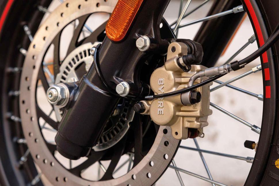Одной из отрицательных сторон Scram оказались откровенно вялые и неинформативные тормоза, взятые с Himalayan. Передний двухпоршневой ByBre на 300-м диске требует сильного выжима для хоть сколь-нибудь ощутимого тормозного усилия, так что тормозить обоими контурами приходится почти постоянно. Причём именно передний остаётся мягким даже при полном выжиме, лишь в конце хода становясь деревянным, и это при том, что мотоцикл ощутимо легче Himalayan.