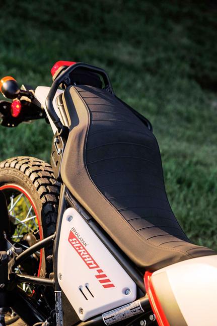 15-литровый бак Royal Enfield Scram 411, тот же, что и на Himalayan, а вот сзади Scram получил "городские заглушки", прикрывающие крепления, предназначенные на Himalayan для установки багажных рамок. В сочетании с укороченным цельным сиденьем, небольшой ручкой и новыми поворотниками задняя часть мотоцикла выглядит более компактно. По отдельности эти мелочи вроде бы ни на что не влияют, но вместе создают довольно разительное отличие во внешнем виде. Дизайнеры Royal Enfield проделали весьма неплохую работу по созданию минималистичной внешности при сохранении вездеходных качеств.