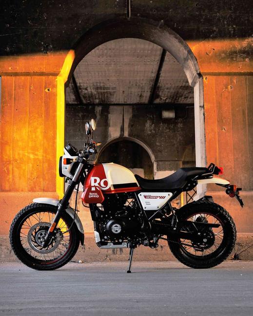 Основным отличием Royal Enfield Scram 411 от Himalayan является внешний вид: он лишился турэндурного клюва, взамен получив обычное крыло поверх передней шины. Её он избавился от ветровика и багажников. Фара на нём расположена ниже, а руль смещён вниз и назад (на 20 и 60мм соответственно), создавая всё ещё вертикальную, но с бОльшим наклоном вперёд посадку.