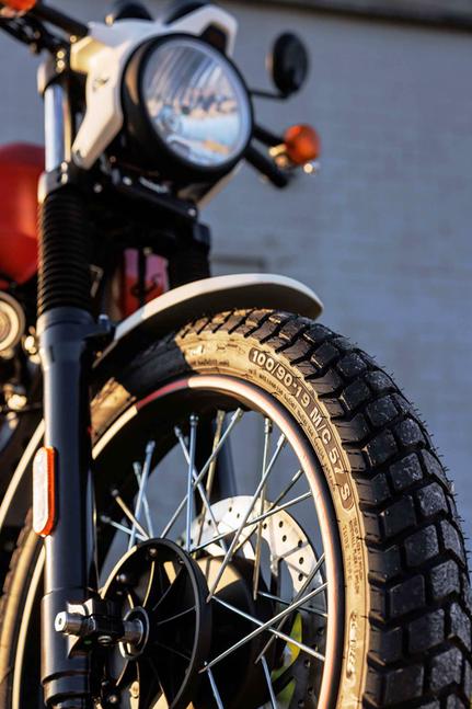 Ещё одной важной особенностью Royal Enfield Scram 411, определяющей его более асфальтовую геометрию, является 19-е переднее колесо (17-е заднее осталось прежним). С ним угол вилки стал чуть более крутым, а колёсная база слегка укоротилась вместе с ходом передней подвески. Переехавшая пониже фара облачена в уникальный миниатюрный литой кожух, сглаживающий профиль мотоцикла. Приборная панель самая простая, с двумя разноразмерными круглыми приборами чуть спереди от руля. Один из них - аналоговый спидометр со встроенным ЖК-дисплеем (но без тахометра), а второй - это как раз пресловутый Tripper, компактный и довольно симпатичный мотонавигатор, работающий в паре со смартфоном. Правда, тут нужно учесть, что на представленных на обзор мотоциклах Tripper установлен с завода, но в базовую комплектацию он не войдёт и будет доступен как опция. Как и Himalayan, Scram лишён трекшн-контроля, режимов езды и наклонной ABS, а из всех ассистентов оборудован лишь старой доброй двухканальной ABS, которая, в отличие от заднего контура на Himalayan, не отключается.