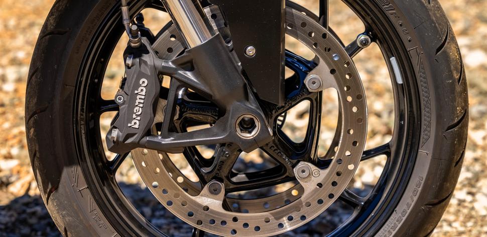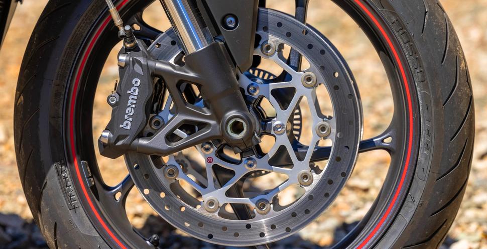 Невозможно не влюбиться в завывания рядной тройки Triumph, и в его характер. 765-кубовый “малыш” на диностенде выдал больше мощности в пике, чем все остальные - 109,2лс, но пик этот приходится практически прямо на отсечку в 12000. И честно говоря, для дорожного мотоцикла крутить двигатель в отсечку — это моветон. Неудивительно, что пиковое значение крутящего момента в 71Нм - самое малое из всей группы. К чести Triumph, кривая тяги у него практически идеальная, только она ниже, чем у остальных.