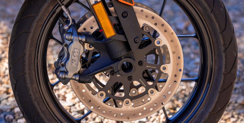 А отсюда - и подвески попроще, и тормоза - не от Brembo, но, если честно, всё это неважно. Нерегулируемая вилка работает весьма пристойно, а суппорта J.Juan сжимают 300-миллиметровые диски ровно с той силой, с какой нужно. В общем, 890 Duke в своей базовой версии оснащён не минимально, а достаточно. Достаточно для того, чтобы кататься с удовольствием и быстро - не так быстро, как например мог бы 1290 Super Duke, но вполне весело.