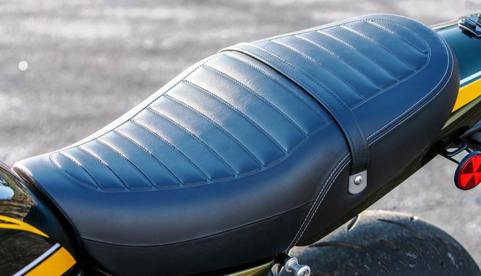 Хромированный руль Z900RS установлен через резиновые проставки, подножки тоже покрыты резиной, а 948-кубовый двигатель по всему диапазону оборотов крутится спокойно и вальяжно. Ты просто слышишь, как там внутри что-то быстро вращается, но не чувствуешь - а более мягкая подвеска лучше изолирует от дороги пятую точку райдера.