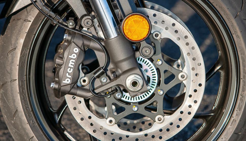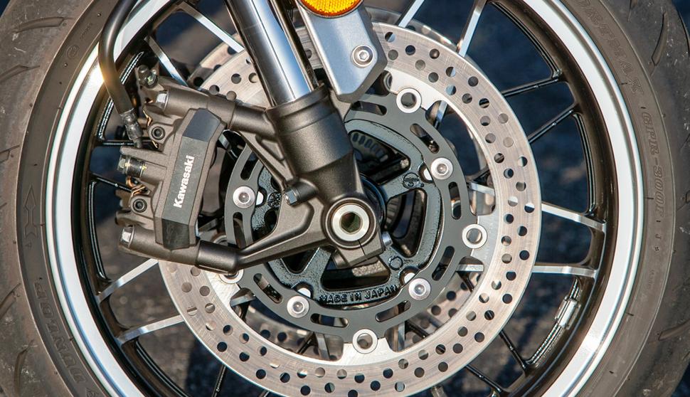Низкопрофильные шины Dunlop Roadsport 2 в этом очень поспособствуют. Dunlop Sportmax GPR-300F, стоящие на Kawasaki, имеют более округлый профиль, что улучшает несколько вялую управляемость Z900RS, а упомянутый Dunlop Sportmax Roadsport 2 наоборот чуть снижает валкость Katana и добавляет ей курсовой устойчивости, хоть на прямой, хоть в наклоне.