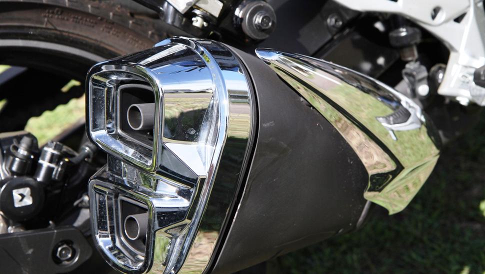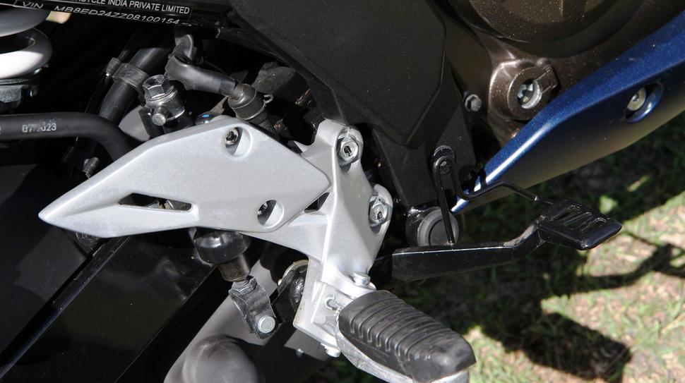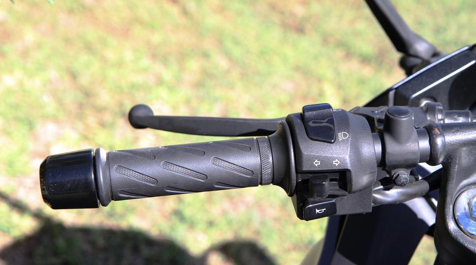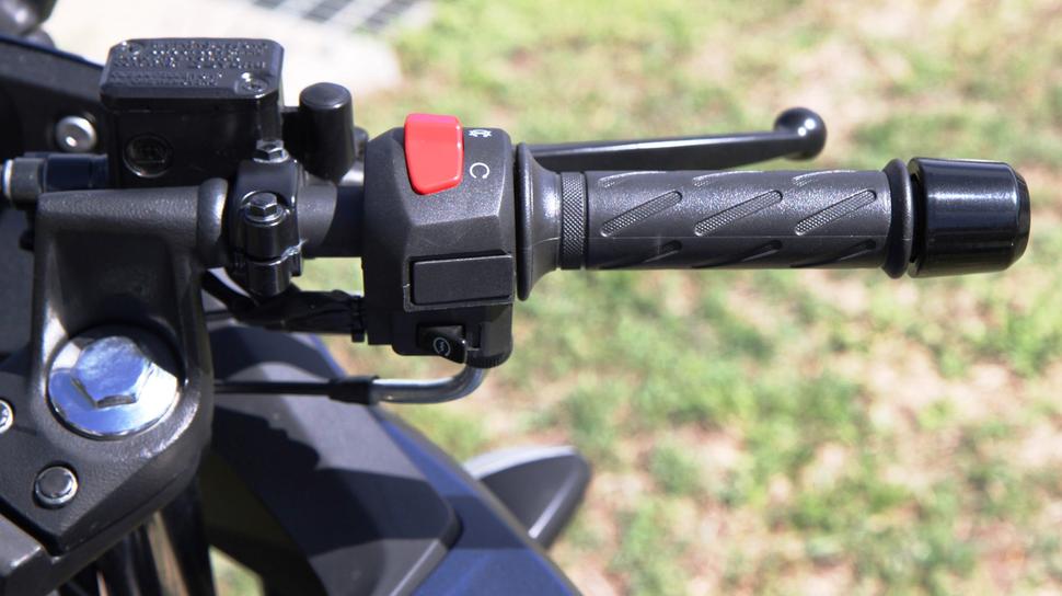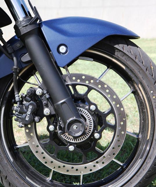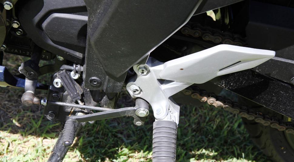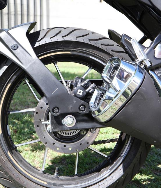 Задний тормоз - можно сказать, городской. Неплохо тормозит на небольших скоростях, но ему не хватает начального захвата и тормозного усилия. Неудивительно, учитывая крошечный диск и маленький суппорт, но было бы лучше поставить сюда диск побольше. Моноамортизатор с регулировкой преднатяга (до которой почти невозможно добраться) на удивление жёсткий, сэг у мотоцикла довольно небольшой, а сиденье высокое для новичков.