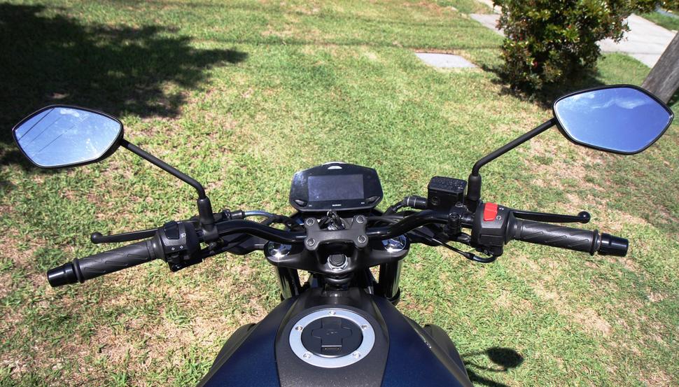 Что касается посадки, то на нейкеде она ощутимо более тесная, и в основном это из-за формы сиденья. В нём сидишь очень плотно и не слишком эргономично в плане мужских органов (да-да). Разница в 5мм высоты по седлу ощущается в плане того, что подножки кажутся более высокими, а руль слишком близко к райдеру. Сиденье кажется более узким и жёстким, чем на SF - возможно, всё из-за положения руля, на самом деле. К сожалению, для высоких ребят нейкед-версия оказалась очень неудобной. Сидишь весь сжавшись, на жёстком седле, и боишься лишний раз шевельнуться на ходу.