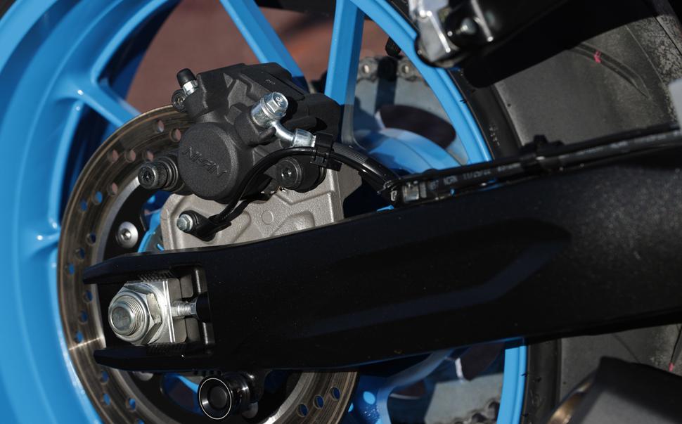Нерегулируемая вилка и регулируемый (ключом!) амортизатор от KYB имеют ходы в 13см. Высота по седлу - вполне приемлемые 81см, а само седло весьма удобное. 17-дюймовые литые колёса идеально подходят для этого спортивного скакуна, равно как и рулевая геометрия - 104мм трейла и 25 градусов угла рулевой колонки. В сочетании с колёсной базой 1465мм они обеспечивают стабильный ход и отличную управляемость. Весит мотоцикл в полностью снаряжённом состоянии 201,8кг.