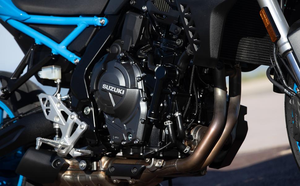 Как уже упоминалось, у Suzuki GSX-8S есть брат-соплатформенник, Suzuki V-Strom 800 DE 2023 года. Обе модели имеют одинаковый двигатель и стальную раму, в которой мотор крепится в качестве нагруженного элемента шасси. 776-кубовая рядная двойка с двумя верхними распредвалами имеет поршни диаметром 84мм с ходом 70мм, а степень сжатия в цилиндрах равна 12,8:1. По официальным данным, Suzuki GSX-8S 2023 года производит до 82лс на 8500об/мин и 78Нм на 6800об/мин, а отсечка у мотора наступает на 9250об/мин.