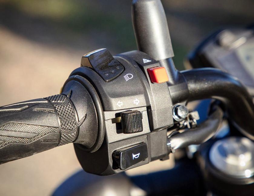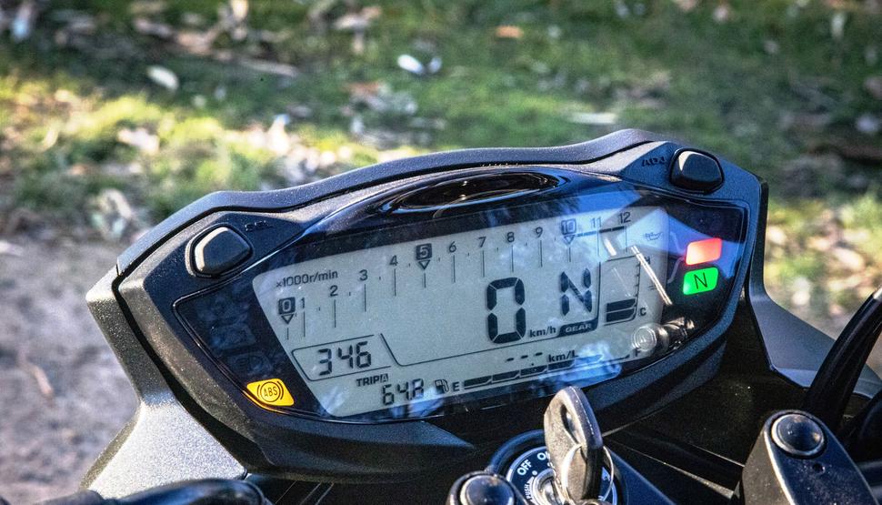 По меркам 2025 года ЖК-дисплей приборной панели довольно примитивный, и это неудивительно, ведь взяли его ровно из той корзины, в которой лежали запчасти для GSX-S1000 2016 года. Однако, дисплей чёткий, легко читаемый и отображает всё необходимое: тахометр, часы, два трип-метра, номер передачи, температуру двигателя, расход топлива в реальном времени и оставшийся запас хода.