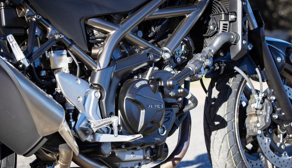 Несмотря на всё более строгие экологические нормы, меняющиеся тренды и переполненный рядными двойками сегмент среднекубатурных дорожников, Suzuki SV650 каким-то образом остался верен традиционной компоновке двигателя - 90-градусному V-твину. Последнее крупное обновление произошло в 2016 году, когда Gladius уступил место SV650 с его более простым дизайном. С тех пор, конечно, многое изменилось, но основная формула осталась прежней. 645-кубовый 90-градусный V-твин жидкостного охлаждения всё так же отлично тянет и хорошо звучит, хоть и имеет более чистый выхлоп. Нынешняя версия соответствует Euro5, но геометрия цилиндров осталась той же, что и в модели 1999 года. От 39-миллиметровых карбюраторов Suzuki, разумеется, давно отказались, перейдя на сдвоенную дроссельную заслонку, а в глушителе находится каталитический нейтрализатор, который с каждой экологической итерацией становится всё больше. Но в основном SV650 представляет собой классический пример поговорки “не сломалось - не чини” в доказательство того, что Suzuki изначально заложили в его основу правильные принципы.