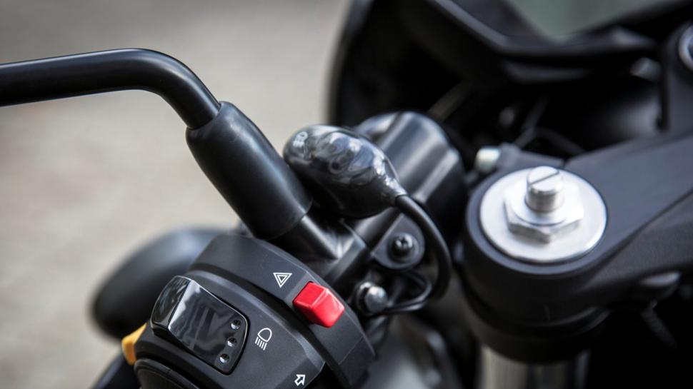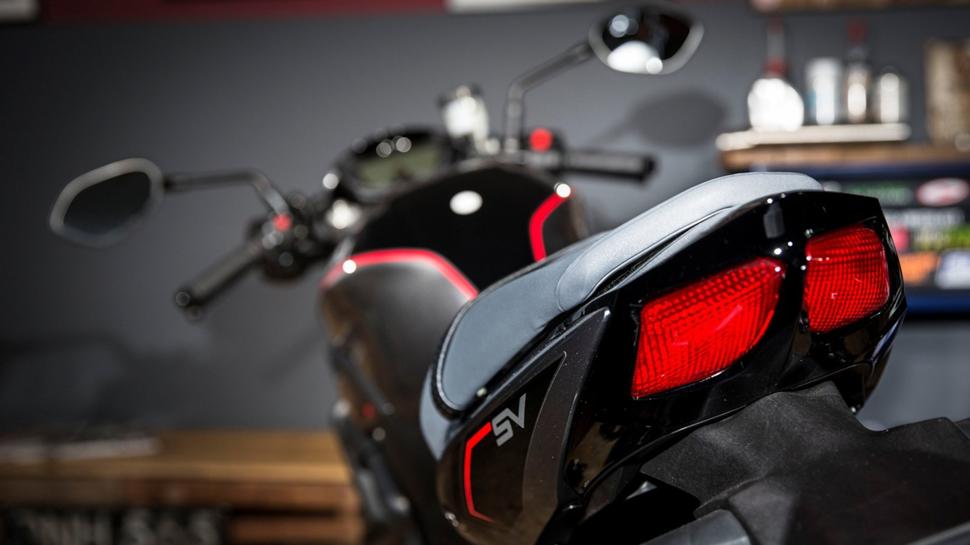 Фанатам нейкедов не стоит волноваться: частичная капотировка, стиль которой восходит к гоночным автомобилям 70х годов, увеличивает вес ненамного, примерно на 2 кг, так что новый SV не станет пластиковым спортбайком. Круглая фара вносит в стиль мотоцикла привкус ретро, как и чернение части деталей, восходящее к кастом-культуре, откуда и появились кафе-рейсеры. Позади 14-литрового бака “дутое” сиденье образует неглубокое углубление для водителя и быстро сходится в острый хвост над поднятым подрамником. Задний фонарь-стопсигнал встроен в хвост, а поворотники - в держатель номера , все огни здесь диодные, обеспечивающие максимальную видимость и безопасность. Приборная панель практически целиком цифровая, с буквально парой индикаторных лампочек, дополняющих ЖК-дисплей. Подсветка дисплея настраивается под условия освещения, и кажется, что производитель проделал хорошую работу, так как все важные параметры видны в любых ситуациях.