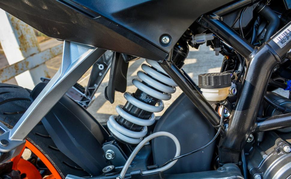 В плане управляемости всё тоже очень хорошо. Проверенная временем конструкция рамы-клетки, 43-я перевёрнутая вилка и задний моноамортизатор от WP как всегда хороши. Широкие шины MRF Revz, 110-я спереди и 150-я сзади, унаследованные от 200-кубовой версии, здесь даже несколько избыточны, но это не отменяет того, что KTM 125 Duke - один из наиболее легко управляемых 125-кубовых мотоциклов и способен посостязаться со 150-кубовыми соперниками. Также он имеет очень неплохую тормозную систему, и единственное, чего остаётся желать - это двухканальная ABS вместо имеющейся одноканальной. В целом, KTM 125 Duke - очень приятный мотоцикл, отлично подходящий в качестве учебного первого мотоцикла для тех, кому мало чисто утилитарных азиатских аппаратов.