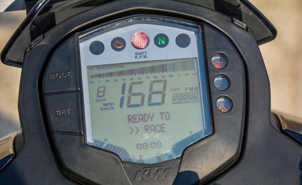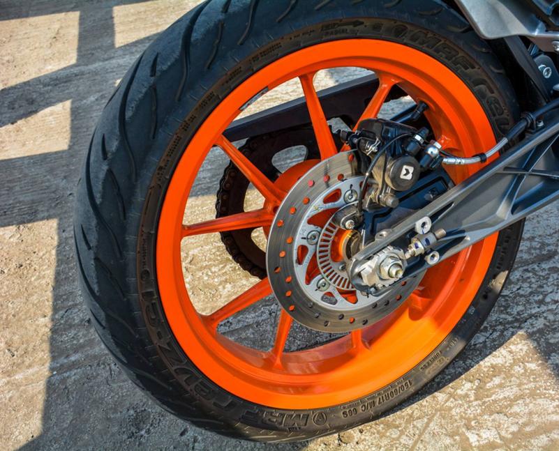 Тест показал, что до максимальной цифры на спидометре (которая составляет 110 км/ч) он добегает быстрее большинства одноклассников. 60 км/ч он набирает за впечатляющие 5,5 секунд, и это как минимум на секунду быстрее, чем большинство 125-к и лишь на полсекунды дольше, чем у TVS Apache RTR 160 4V (5,09 секунд). Что ещё важнее, 125 Duke имеет такой же взрывной характер, как и другие Duke, поэтому ездить спокойно на нём просто не хочется. У него имеется уже знакомый по 200-ке подрыв на 7000 оборотах, и хотя он пинается помягче, но не даёт забывать о своём родовитом происхождении.