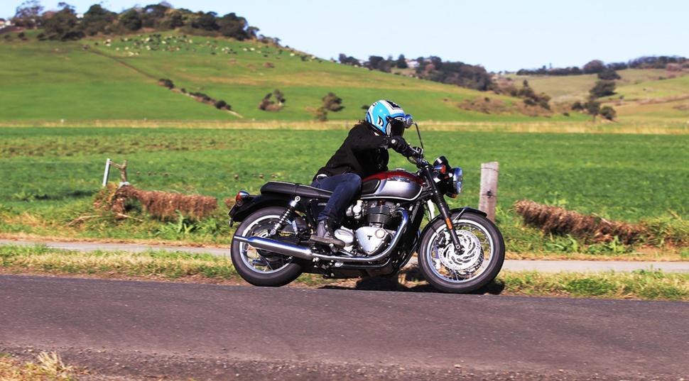 В поворотах Бонни ведёт себя великолепно. Он не так охотно наклоняется, как какой-нибудь пластиковый спортбайк, но любит проходить повороты на гораздо более высокой скорости, чем ожидаешь на первый взгляд. Вес мотоцикла на ходу не ощущаешь, пока не попробуешь поставить его на заднее - сразу понимаешь, что взял не свой вес. Совершенно непонятно, как были сделаны фотографии вилли на этом паровозе.