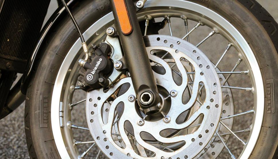 Тормоза состоят из двух 310-миллиметровых передних дисков с двухпоршневым суппортом Brembo на каждом, и они прекрасно справляются с мотоциклом. Конечно, они не представляют из себя ничего экстраординарного, и тем, кто пересаживается на Triumph Bonneville T120 со спортбайка, придётся некоторое время привыкать к необходимости выжимать рычаг намного мощнее, но адаптируешься довольно быстро. Дизайн тормозных дисков, если честно, так себе - они напоминают отрезные диски по камню или что-то типа того.