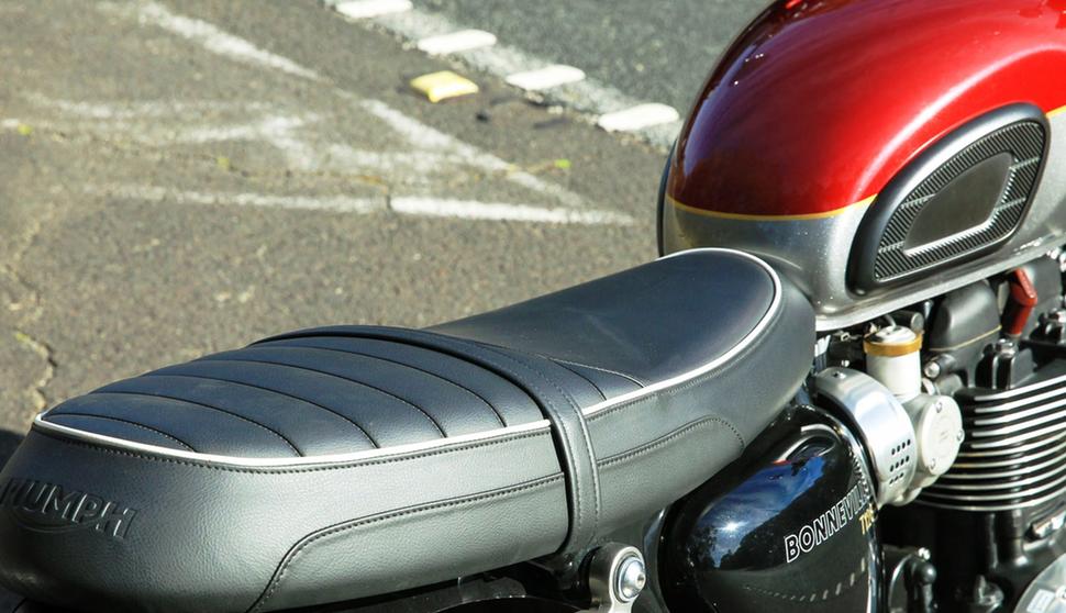 Посадка просто отличная, за 1000 километров она не вызвала никакого дискомфорта, кроме обычных жалоб на затёкшие ноги из-за центральных подножек. Ну, тут ничего не поделаешь, на любом мотоцикле кроме большинства круизёров есть эта проблема. Рулём легко ворочать мотоцикл в пробках и закладывать в повороты, а вертикальная посадка совершенно естественная и комфортная. Седло отличное, по сравнению с ним сёдла более современных моделей кажутся набитыми пенобетоном. Bonneville T120 - решительно другое дело, его длинное седло приятное и комфортное, не слишком мягкое и ты в нём не тонешь, оно не мешает быстро свешиваться или менять положение тела. Небольшая выемка в нём удерживает вас на месте достаточно хорошо для мотоцикла, совершенно не предназначенного для спортивной езды.
