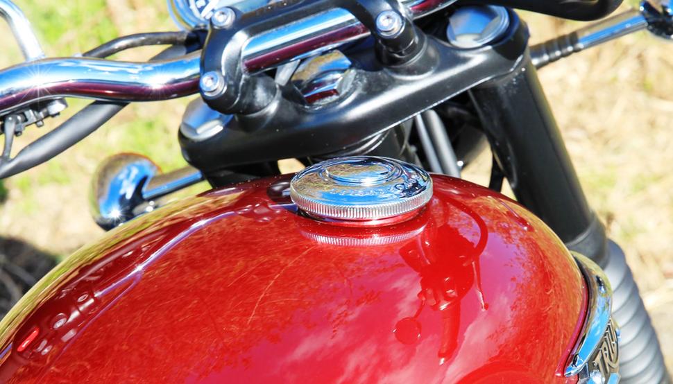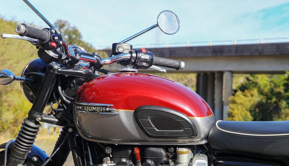 Классический бак с резиновыми накладками украшен традиционным хромированным металлическим шильдиком Triumph, придающим узнаваемому дизайну T120 новый штрих. Классическая хромовая отделка использована повсюду, в том числе на зеркалах, стойках крыла, поворотниках, глушителях, руле, окантовке фары и крышке бензобака. Седло с контрастной окантовкой и рубчатой верхней поверхностью украшено тиснёным логотипом Triumph.