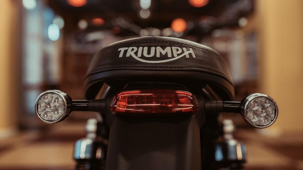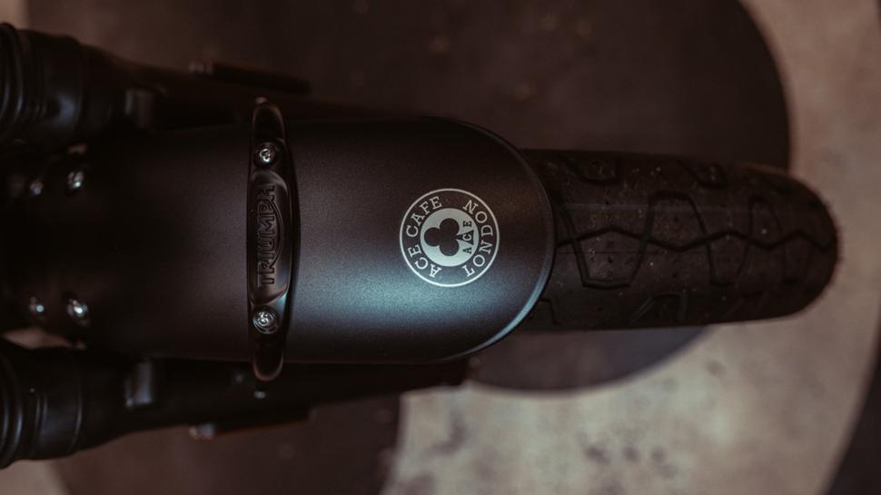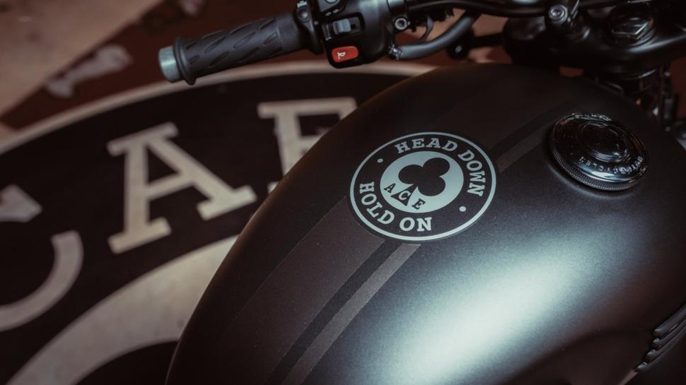 Диодные поворотники дополняют узкий задний фонарь, тоже диодный, а ниже расположен брызговик, выполняющий также функцию держателя номерного знака. Чёрный руль с его греющими грипсами обуславливает посадку с некоторым наклоном вперёд, отлично сочетающуюся со стилем "городского гонщика", но если вы не жокей в душе, не расстраивайтесь - спортивная посадка совершенно не обязательна, потому что подножки имеют центральное положение, обеспечивая прямой угол сгиба коленей и вертикальное положение ног, удобное для активной езды со свешиванием. Резиновые накладки на баке одновременно стильны и удобны, обеспечивая отличный хват коленями. Бак и боковые крышки украшены логотипом Ace Cafe - тузом треф, с надписью Bonneville, заменившей в этом логотипе надпись Ace Café London вокруг центральной части оригинальной эмблемы. В таком же логотипе на каплевидном баке красуется надпись "Head Down - Hold On" (в переводе нечто типа "пригнись и держись"). Бак переходит в плоское сиденье высотой в 78,5 см, удобное почти для любого райдера, кроме самых невысоких.