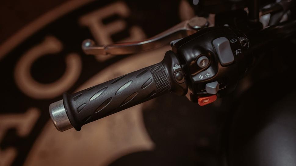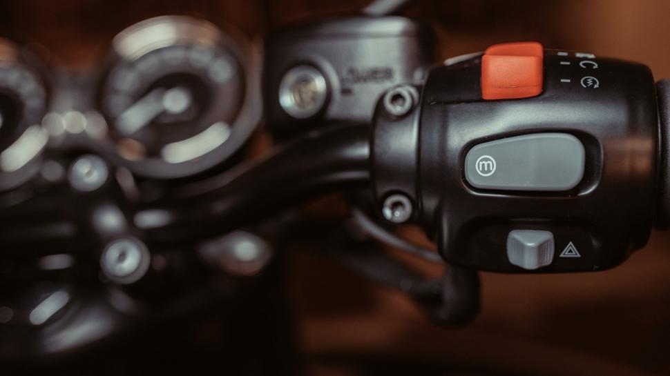 Олдскульные подпорки переднего крыла крепятся к чёрным стаканам вилки на уровне чёрных же гофрированных кожухов, закрывающих перья от грязи, разрушающей сальники. Единственная круглая фара с ходовым огнём разрезает ночь, а прямо над ней расположена пара стрелочных приборов, отображающих скорость и обороты. Индикаторные лампочки встроены в чёрные циферблаты, в нижней части которых находятся ЖК-экраны, отображающие другие важные параметры и служащие интерфейсом между райдером и современными системами байка, такими как трекшн-контроль и режимы езды.