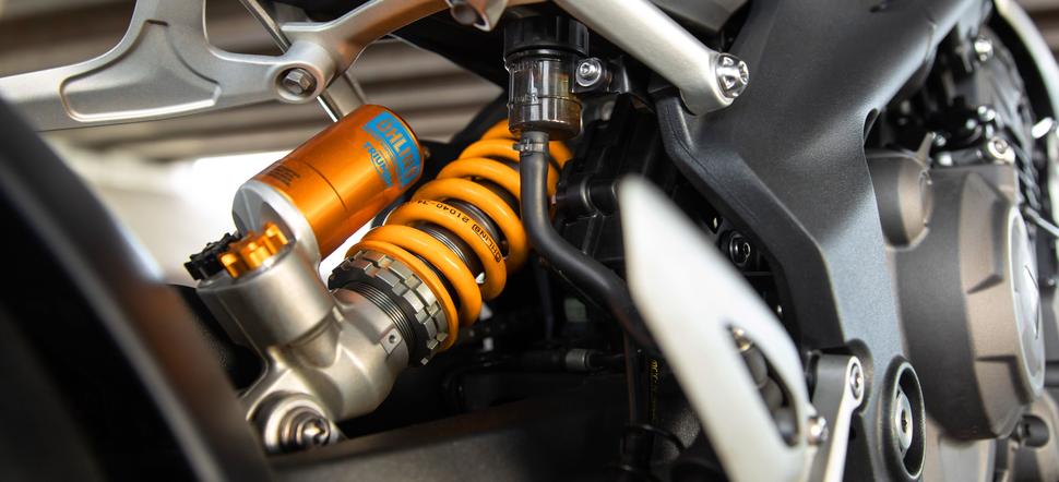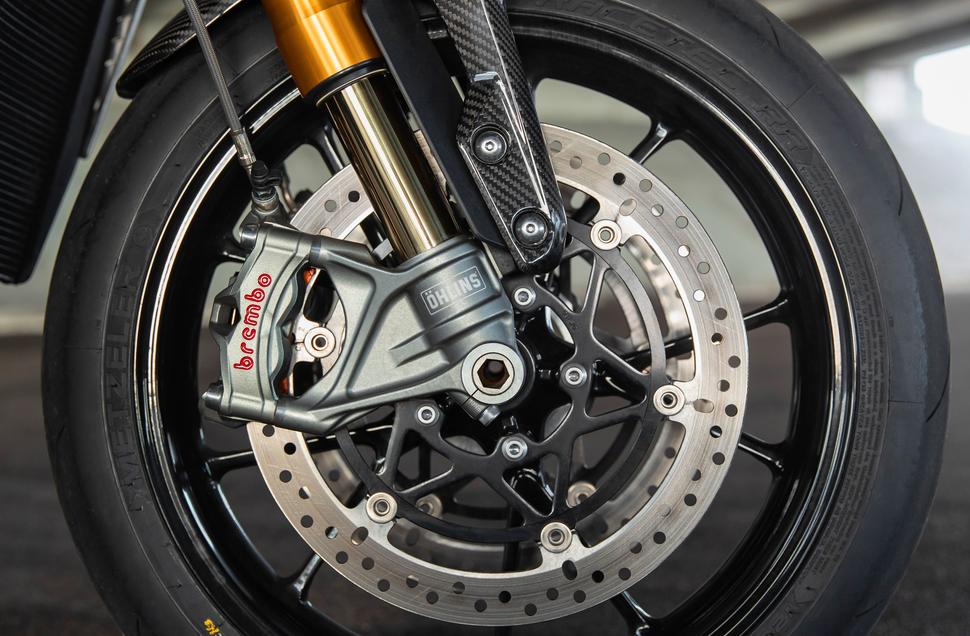 Учитывая то, что Triumph ставит Brembo Stylema даже на базовый Tiger, было бы странно не увидеть их и на Speed Triple. Они установлены на 320-х дисках и приводятся от мастер-цилиндра Brembo MCS с регулируемым ходом и характеристикой ручки. Сзади стоит вполне достаточный двухпоршневой суппорт.