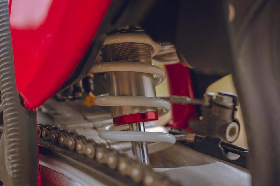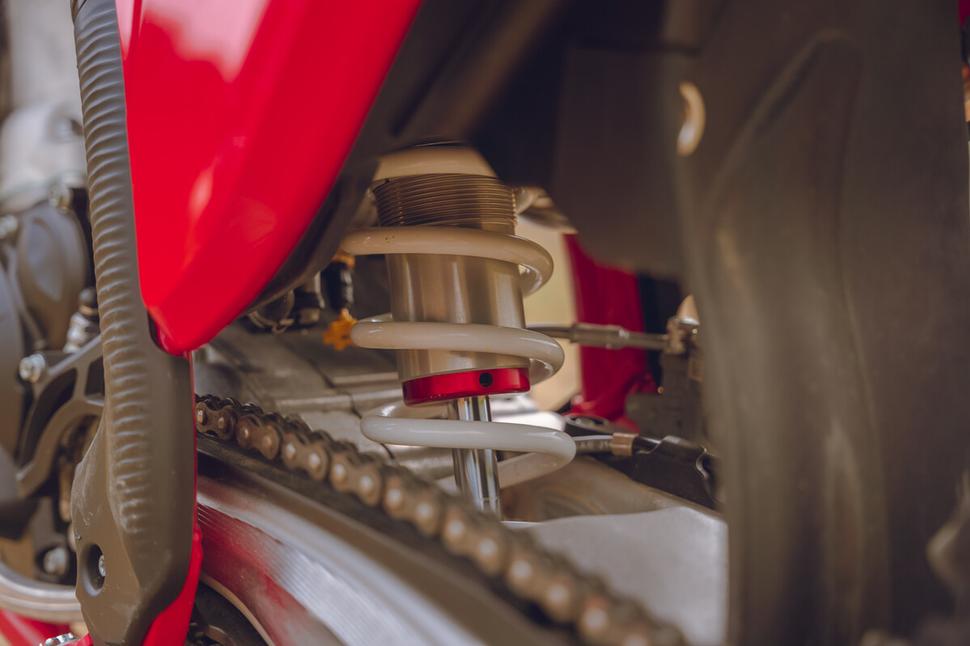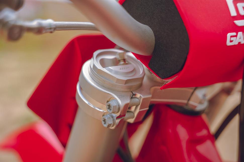 Подвески GasGas MC 250 версии 2024 года оснащены ручными регуляторами, сильно облегчающими настройку. На предыдущих версиях амортизатор настраивался плоской отвёрткой (медленное сжатие и отбой) и 17-миллиметровым ключом (быстрое сжатие), а сейчас всё крутится рукой, даже не снимая перчатки.